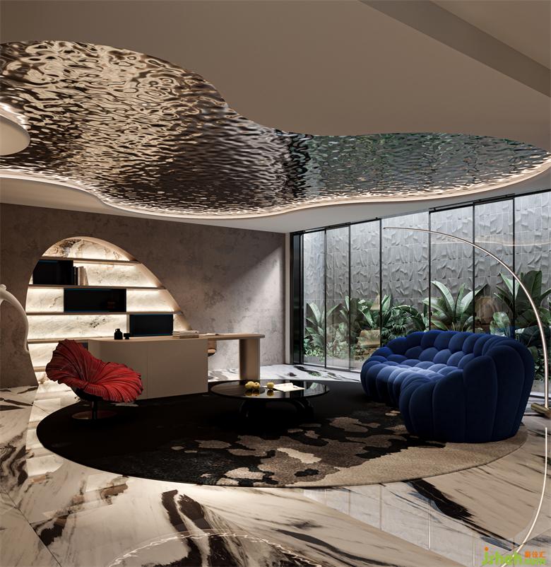 The hollowed out laminates on the curved walls echo the irregular corrugated stainless steel plates on the top. The blue Roche Bobois sofa and the red Bloom single chair boldly collide, setting off a strong fashion atmosphere.