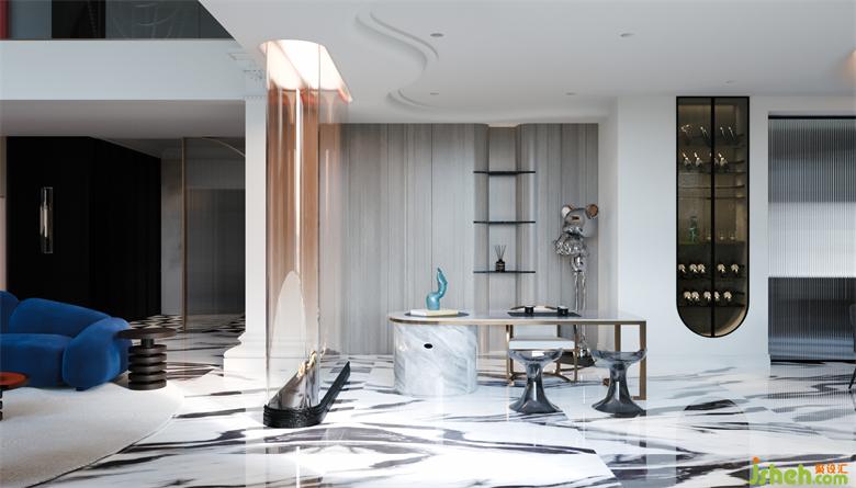 弧形墻面的鏤空層板與頂面的不規(guī)則波紋不銹鋼板遙相呼應(yīng),藍色的Roche-Bobois沙發(fā)與紅色Bloom單椅色彩大膽撞擊,烘托強烈的時尚氛圍。