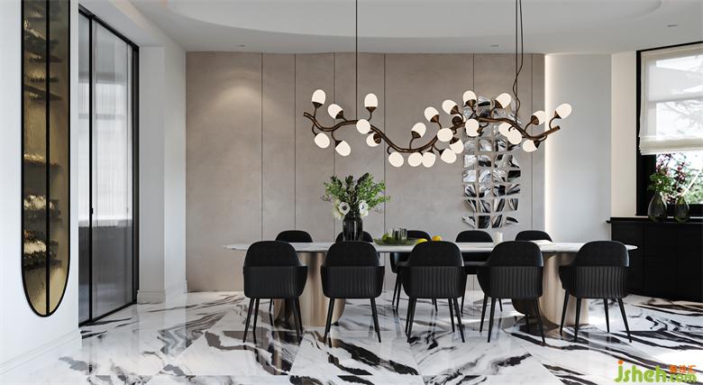 有機(jī)玻璃作為軟隔斷把客廳與餐廚區(qū)域做了分離,餐廳做了更為現(xiàn)代的處理,別墅設(shè)計(jì)大色塊的黑色與金屬不銹鋼為空間賦予了更為摩登的質(zhì)感。
