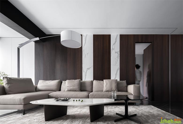 設(shè)計(jì)的都市感,黑白永遠(yuǎn)被追捧,極具質(zhì)感的煙熏橡木木皮把空間的基調(diào)做了鋪陳,山水樾瀾庭家裝設(shè)計(jì)白色的巖板點(diǎn)綴其中,無(wú)疑提升了材料的現(xiàn)代感,墻面延伸至頂面的線形燈光貫通了材料的鏈接關(guān)系。