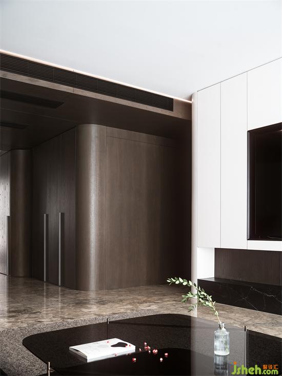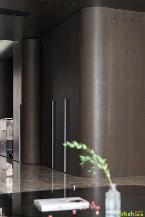 天然的木皮始終帶有獨(dú)特的質(zhì)感,而更加柔和的線條則賦予這種材質(zhì)更多的可能性。瀾山瀾豪宅裝修設(shè)計(jì)我們在保留原始地面不動的情況下,采用木皮來奠定整個空間的主基調(diào),以更多呼應(yīng)的弧形來弱化木皮的硬朗與現(xiàn)代感。