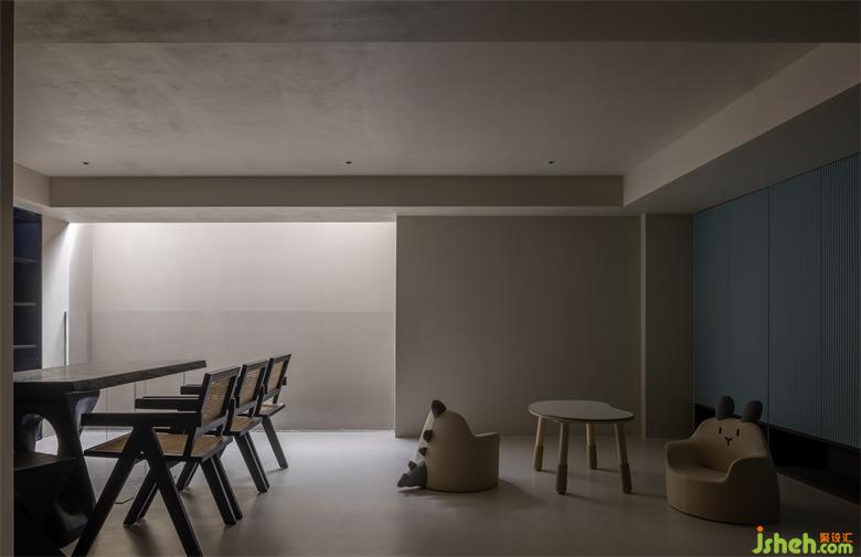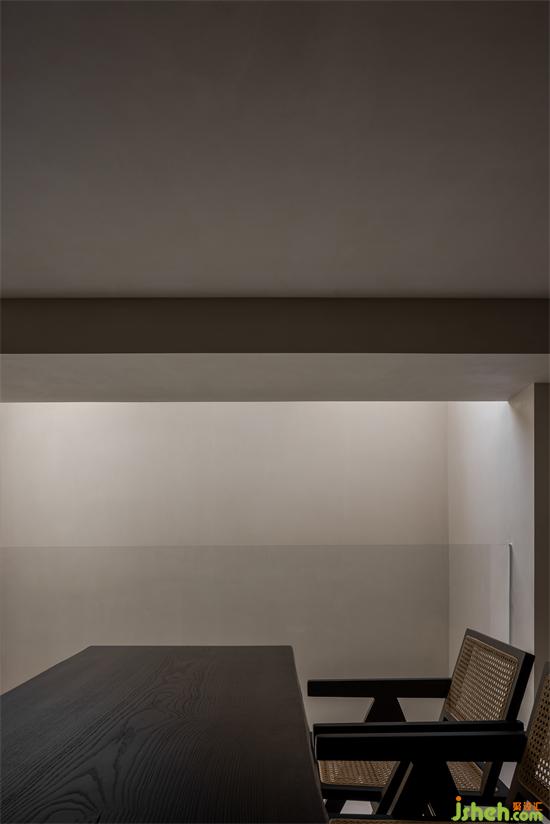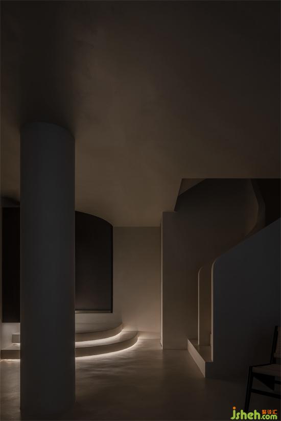 樓梯貫穿至地下空間,則再無多余材質(zhì),微水泥溫潤的包裹著相對幽暗的空間。純粹的設(shè)計也彰顯了無即萬象的禪宗思想。