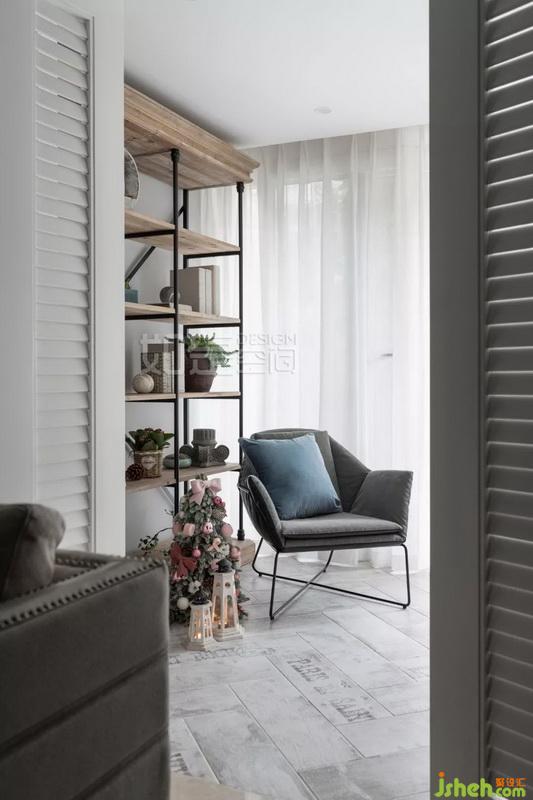 中間木百葉折疊門不影響客廳采光的同時將兩個空間區(qū)隔