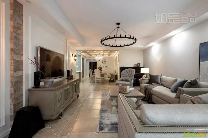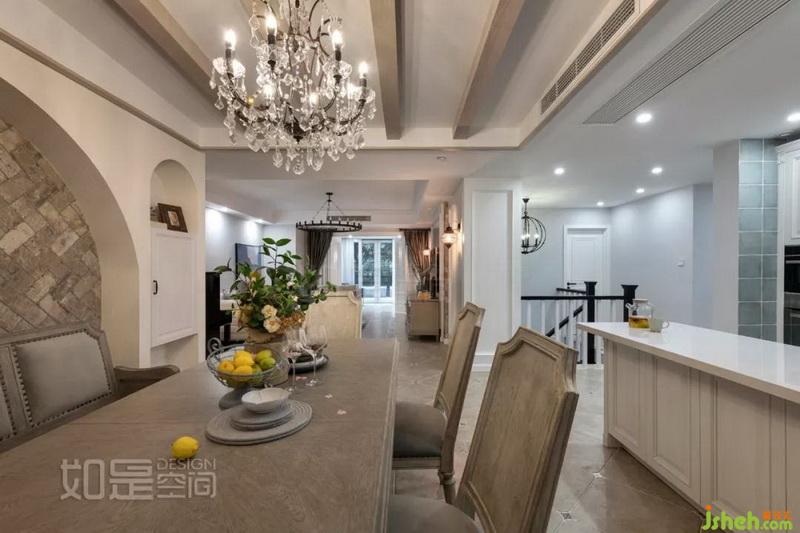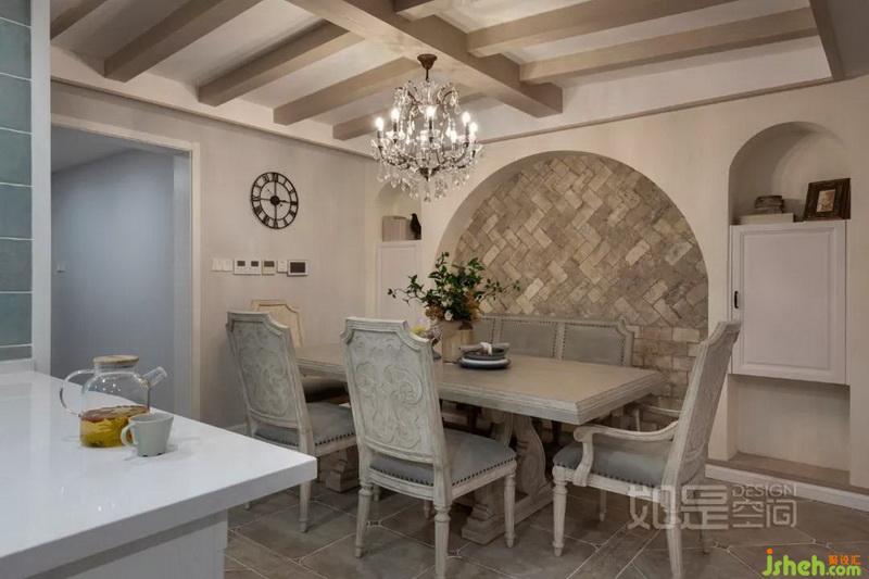 餐廳背景墻采用了對稱的設計,左右的柜子有一定的收納功能。中間精致的人字形文化石鋪貼出優(yōu)雅大氣且?guī)凸艢庀⒌目臻g氛圍,吊頂則采用復古做舊的KD板飾面