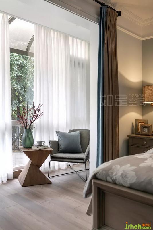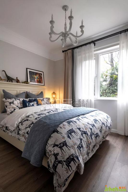 主臥色調(diào)為清新灰綠色,背景色略深一號,層次分明。家具采用和客廳同色系的煙灰色木系。吊燈讓人感受到濃濃的復古情懷,彰顯屋主優(yōu)雅氣質(zhì)。