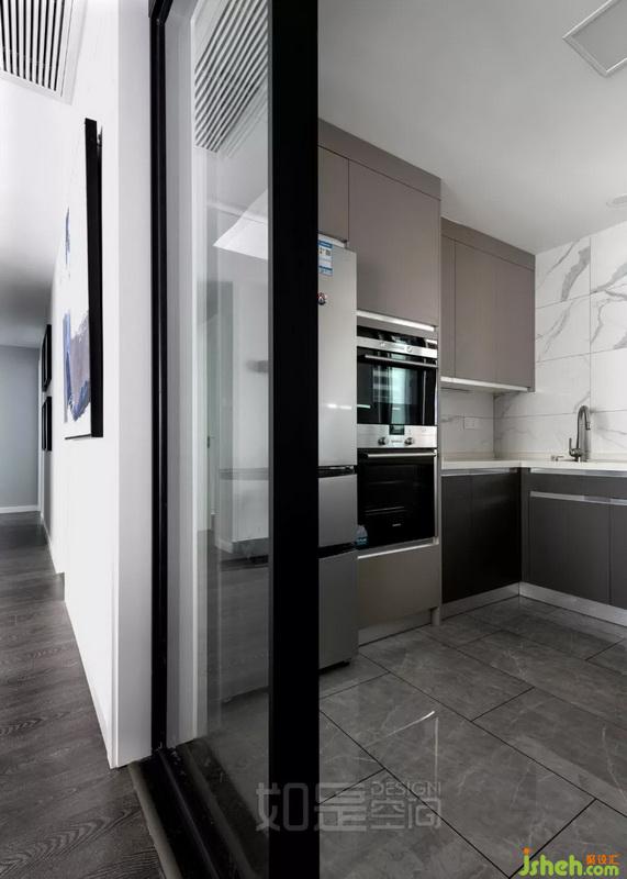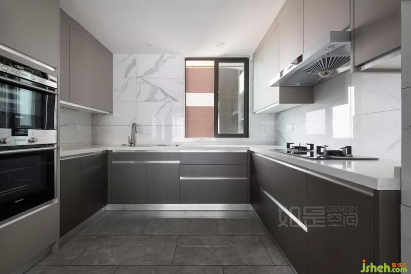 淺色墻頂面與臺(tái)面、略深色的柜門與地面,巧妙營(yíng)造出現(xiàn)代簡(jiǎn)約感