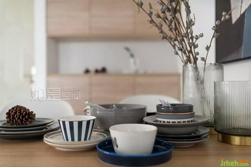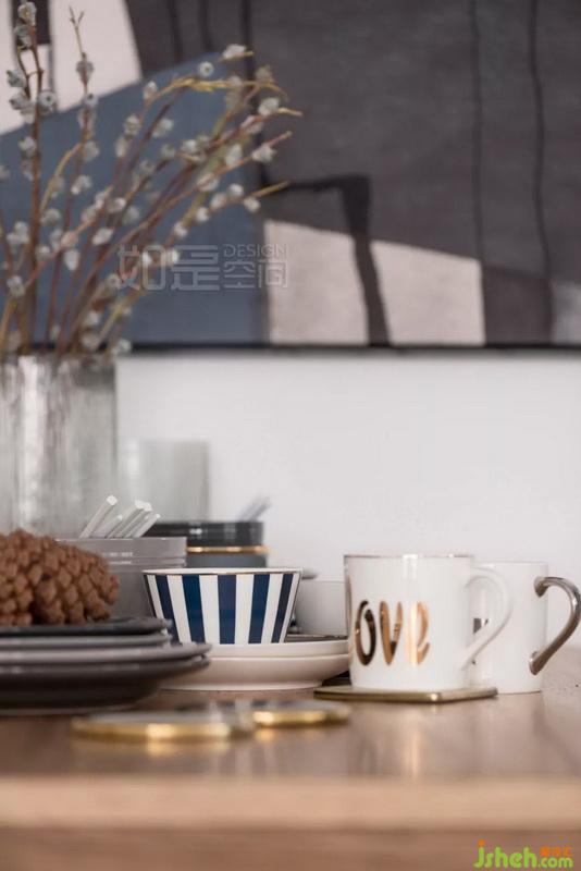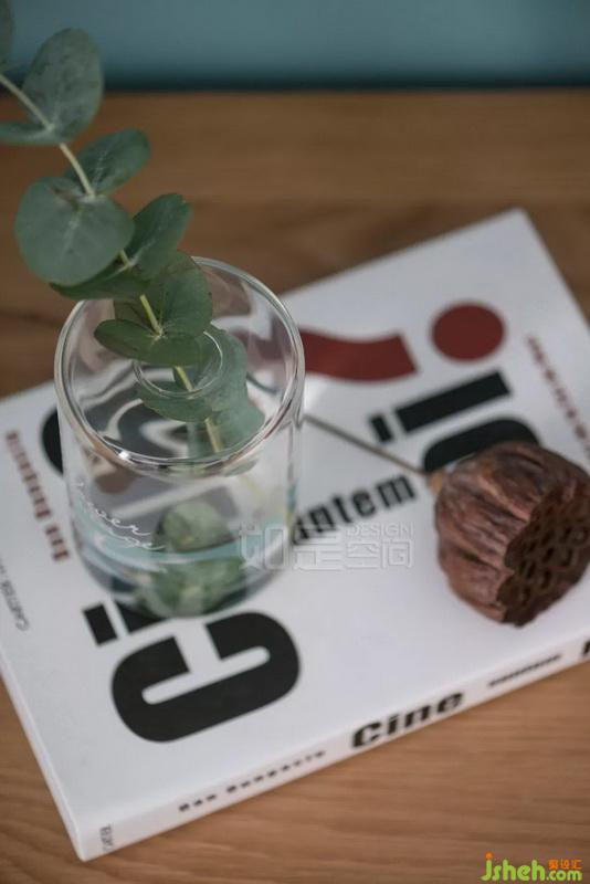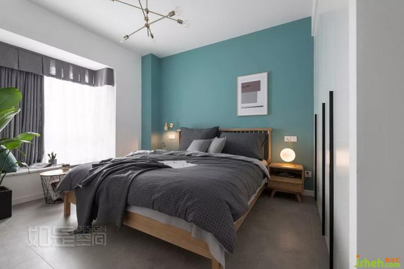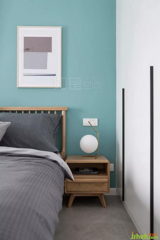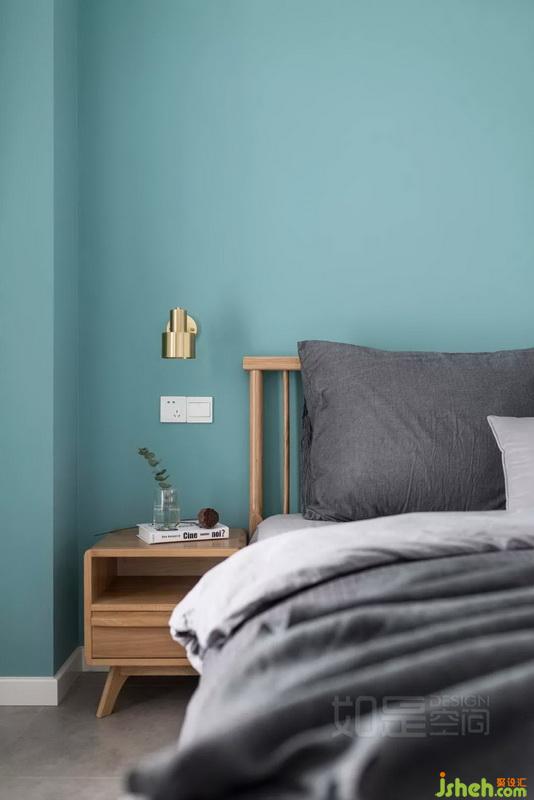 藍(lán)綠色背景,配合白色木門、淺色木床、灰色水泥磚,構(gòu)成主臥空間的舒適寧靜感