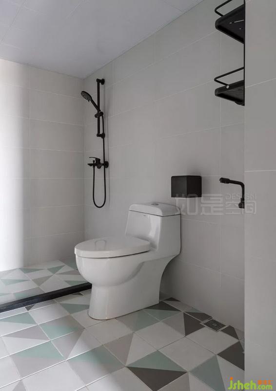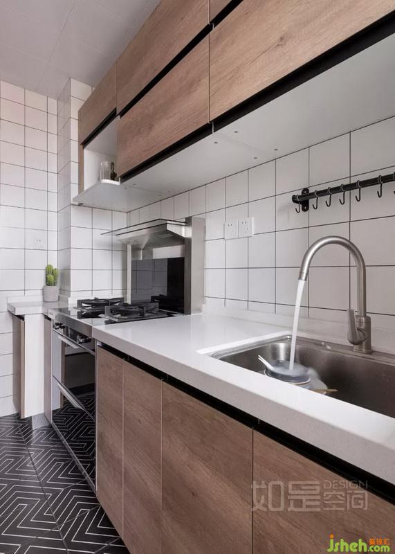 墻面的白磚、柜體的木色,與客廳呼應(yīng),讓整體風(fēng)格一致。地面黑色迷宮磚,給小空間增添些許趣味,避免了呆板感。