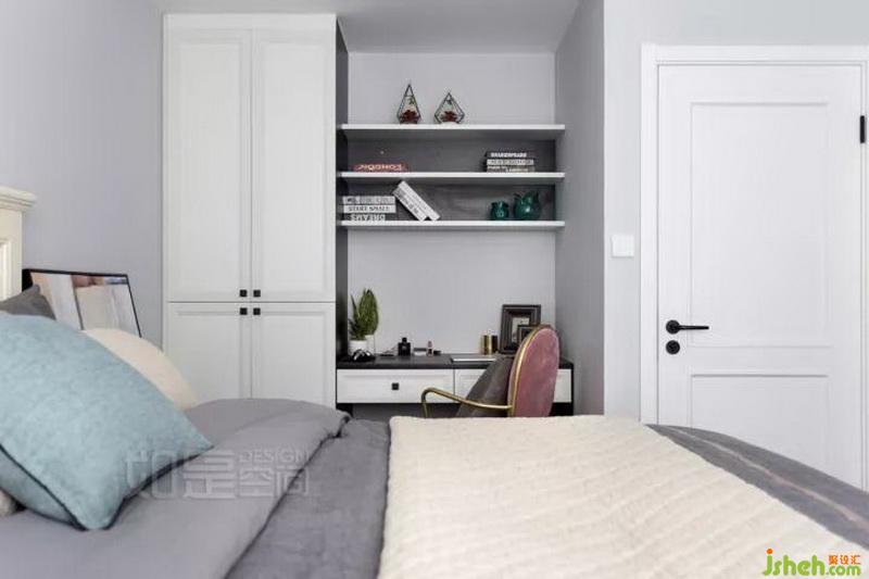 主臥未設(shè)置大尺碼衣柜(另利用小臥房做專門衣帽間),這為主臥帶來了更多的開闊適意感,同時(shí)也為小書桌與書柜贏得了空間。