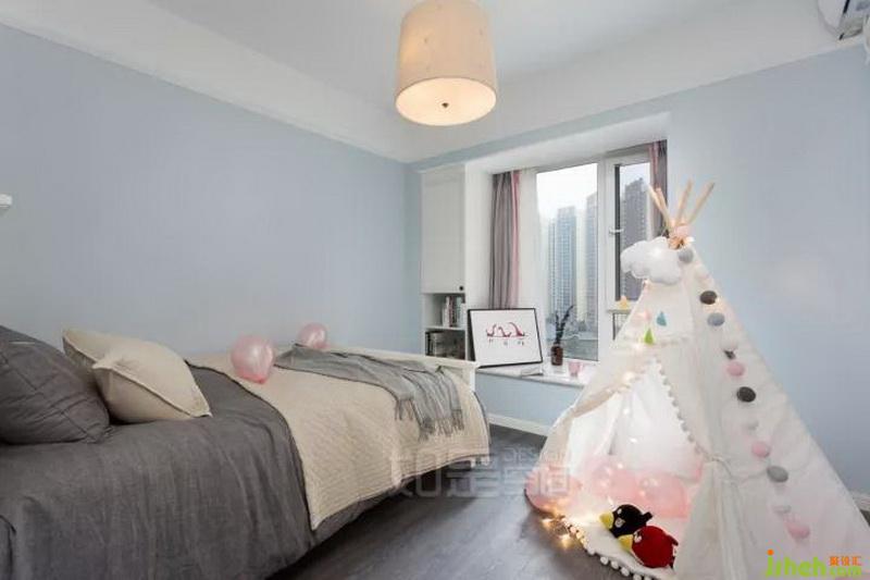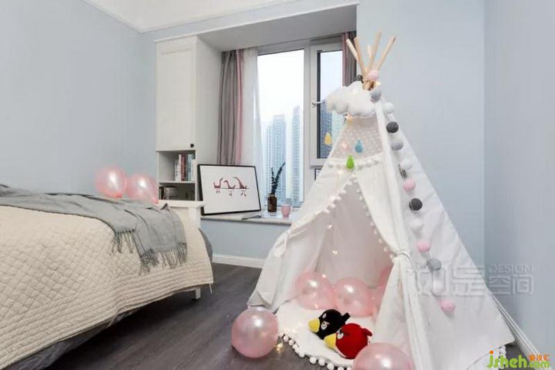 兒童房以淺藍(lán)色為主色,加入可愛粉色軟裝進(jìn)行點(diǎn)綴,充分利用較長(zhǎng)的飄窗增加小朋友讀書區(qū)