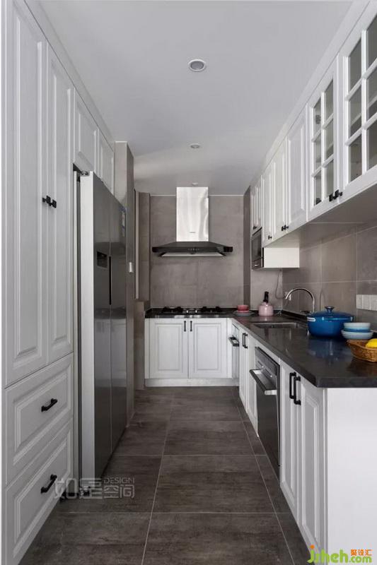 廚房色調(diào)采用灰色、白、黑的搭配,構(gòu)成整潔與酷爽感。