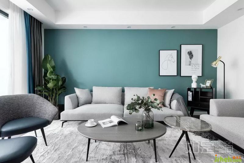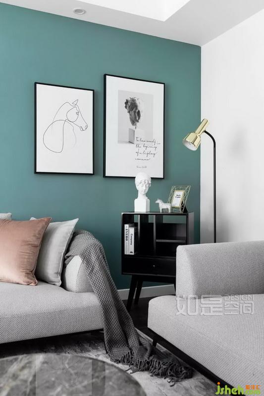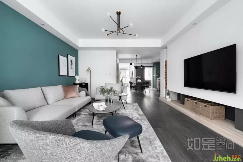 室內(nèi)設(shè)計(jì)師在局部采用深綠、淡藍(lán)、淺灰色的同時(shí),依然保留了大面積空間的純白,以塑造基本的純凈感。電視墻左側(cè)木柴的堆砌則體現(xiàn)出獨(dú)特別致的北歐元素。