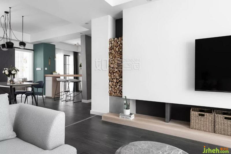 客廳沙發(fā)位置看餐廳、吧臺(tái)、電視墻