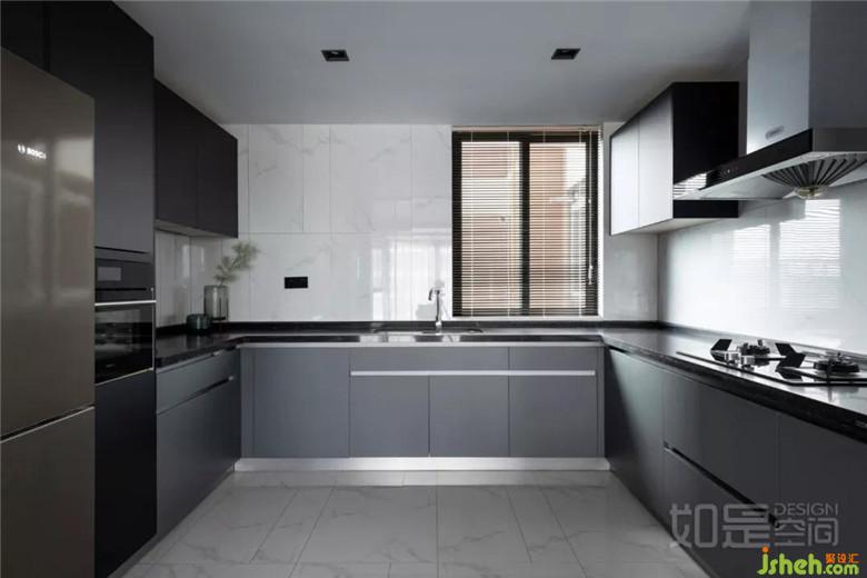 深灰色地柜搭配黑色臺(tái)面,顯得干凈、清爽、有質(zhì)感。