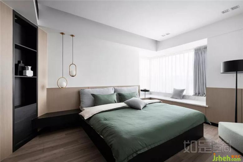 左邊斜面以及床靠背木飾面板造型結(jié)合定制床以及床頭柜,簡(jiǎn)潔、干凈,整體性更好。