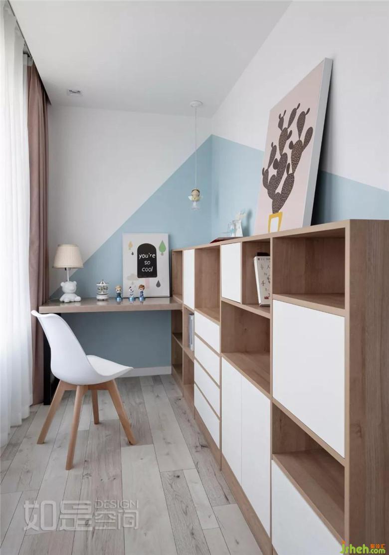 靠窗邊的學(xué)習(xí)區(qū)域采光十足,半截書柜化解了小空間可能存在的壓抑感,也有足夠空間給小朋友放書。