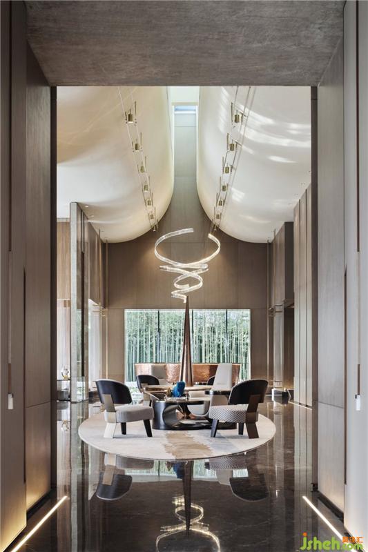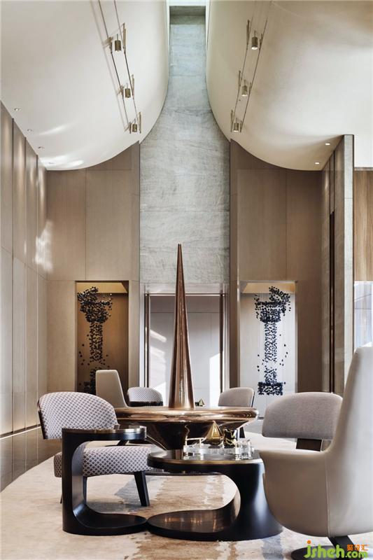 金屬飾面的陀螺裝置,定格在旋轉(zhuǎn)的狀態(tài)卻又靜止恬然,如賓江路五號在時代的川流不息中獨具坦然與自在。室內(nèi)設(shè)計師