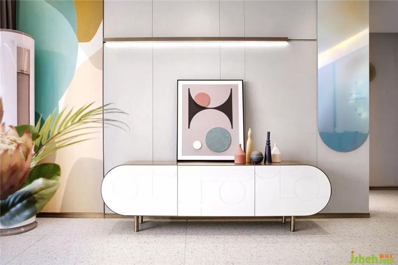 幾何形圖形的裝飾畫(huà),輕靈、藝術(shù),柔軟又溫和,通過(guò)溫柔的燈光與炫彩玻璃完美的交融,呈現(xiàn)出無(wú)與倫比的高級(jí)感。樣板房設(shè)計(jì)