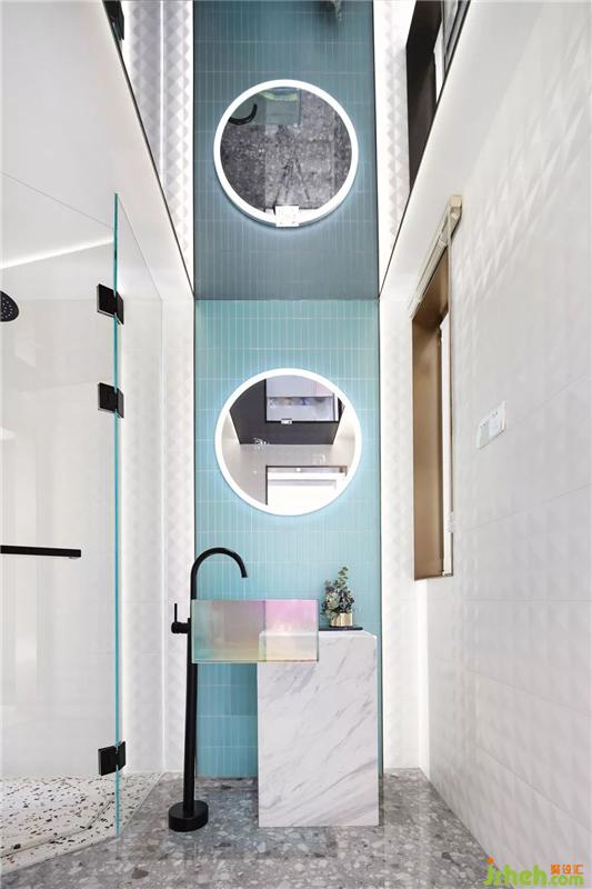 白色與水藍(lán)色交錯的輕奢范兒空間中,搭配黑色金屬,將整個空間烘托的干凈清爽,打破常規(guī)的洗手盆將炫彩玻璃與大理石穿插相結(jié)合時尚又有趣味,用最直白簡潔的方式讓你擁有一刻安寧與靜謐的時光。