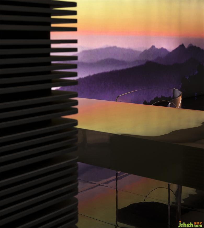 品茶區(qū)呼應著游艇的造型形式,透明玻璃座椅的弧線完全貼合圓的曲度,與墻壁上的山水隔空觀照。我們試圖以鏡像語言突出場域的藝術造詣,整體上烘托出圍茶暢談、親睦融洽的輕松氛圍。