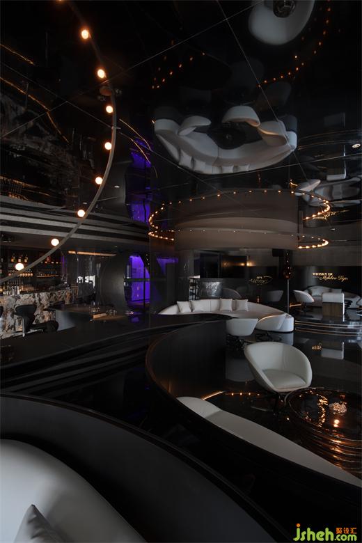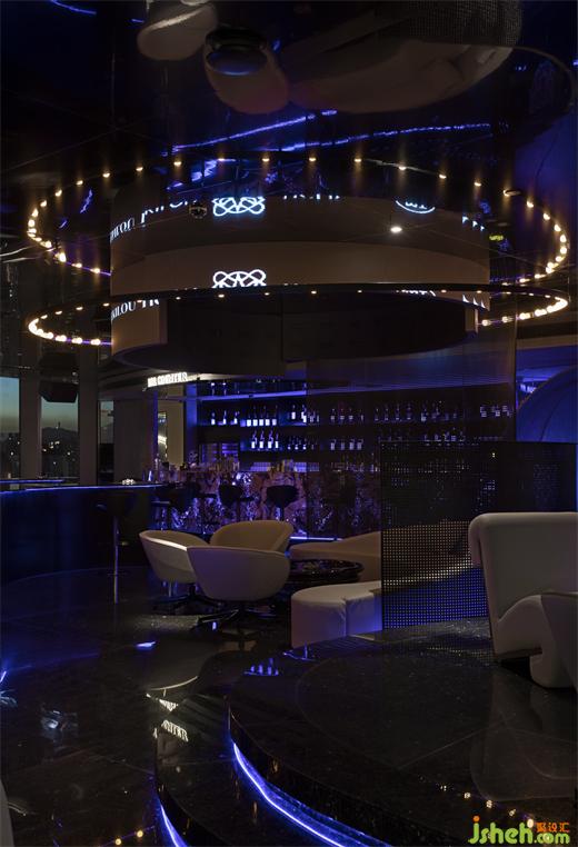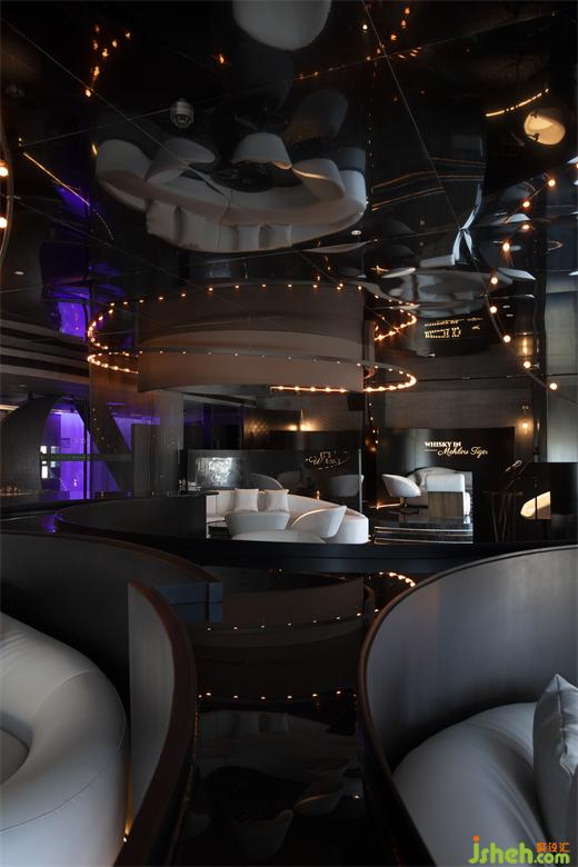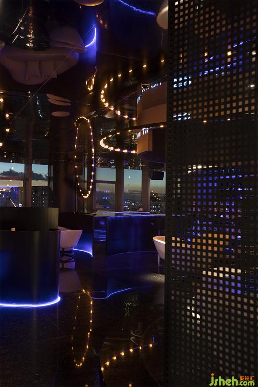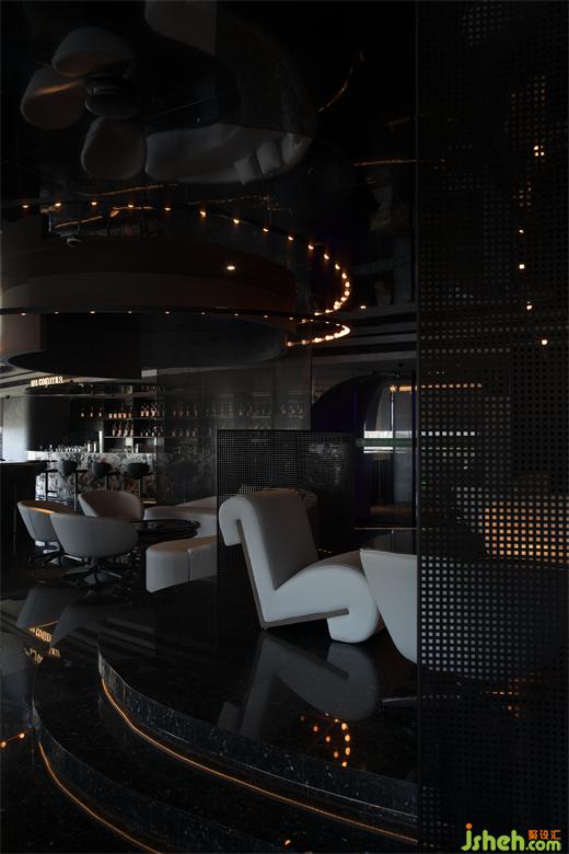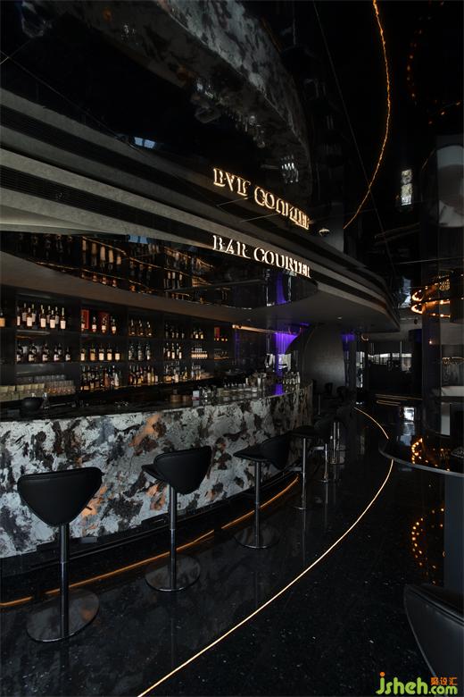 光,是我們對時間的基礎(chǔ)感知,環(huán)繞落地窗讓流動的時間呈現(xiàn)可視化,璀璨夜景盡收眼底,展開空間的敘事。高空酒吧設(shè)計環(huán)周有序分布的氛圍燈像正在運行的小行星,屋頂鏡面板拉長空間整體縱向感,賦予空中酒吧面向未知與神秘的寰宇視野,又或如同月光下的湖泊。