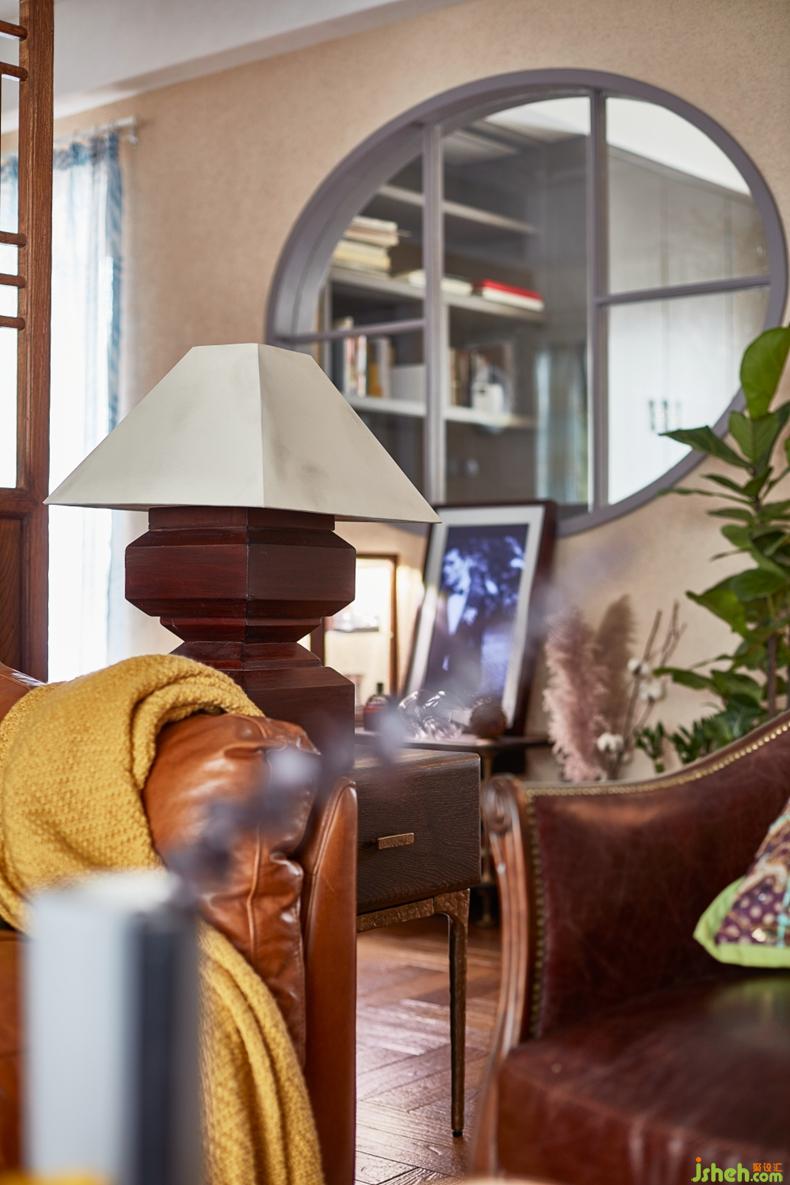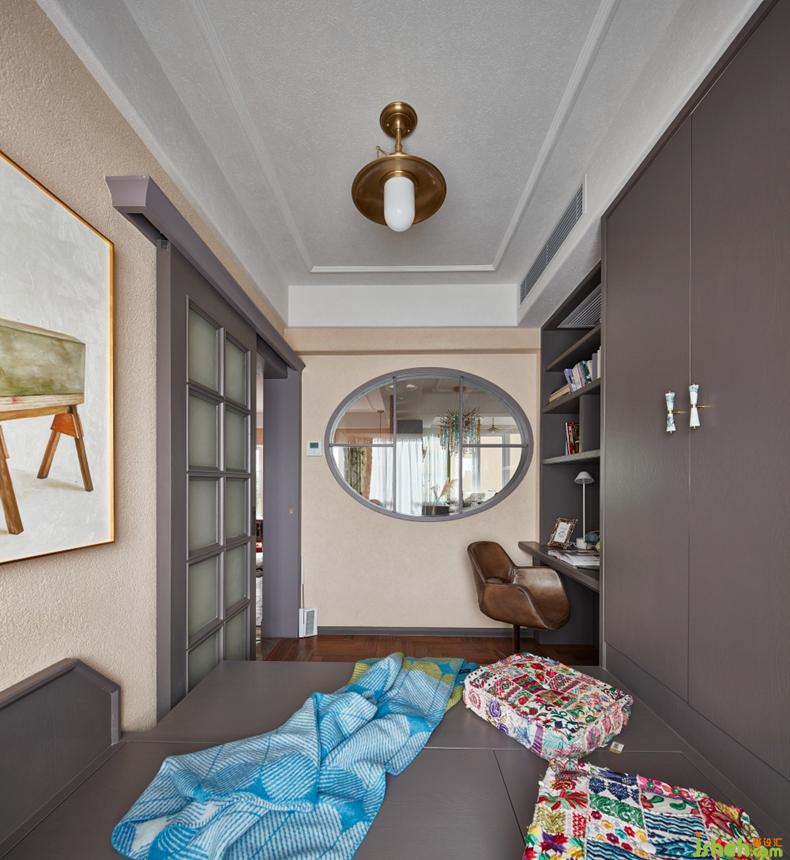 ▲ 書房與客廳的隔墻上開了一個橢圓窗,為本來光線不是很好的客廳區(qū)域增加采光,同時書房的空間感也得到拓展。