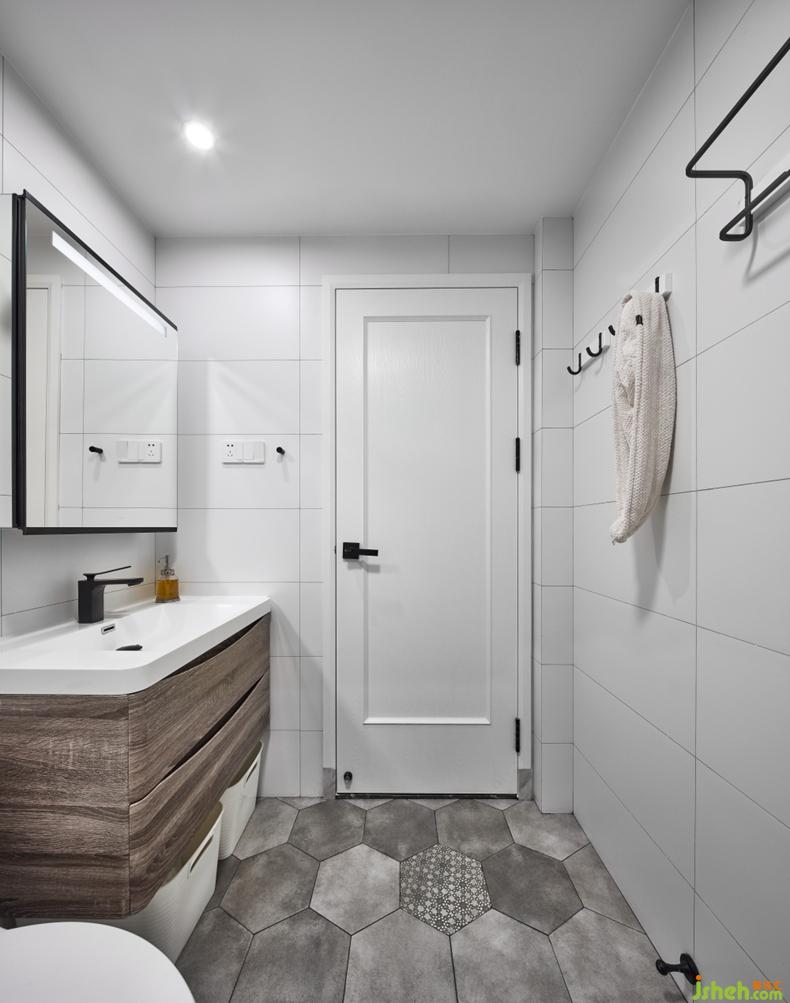 用白色的瓷磚平鋪,讓空間更顯得開(kāi)闊明亮,搭配灰色系的六角磚,花磚點(diǎn)綴局部。