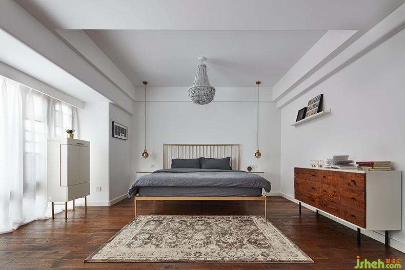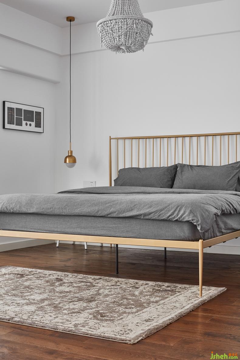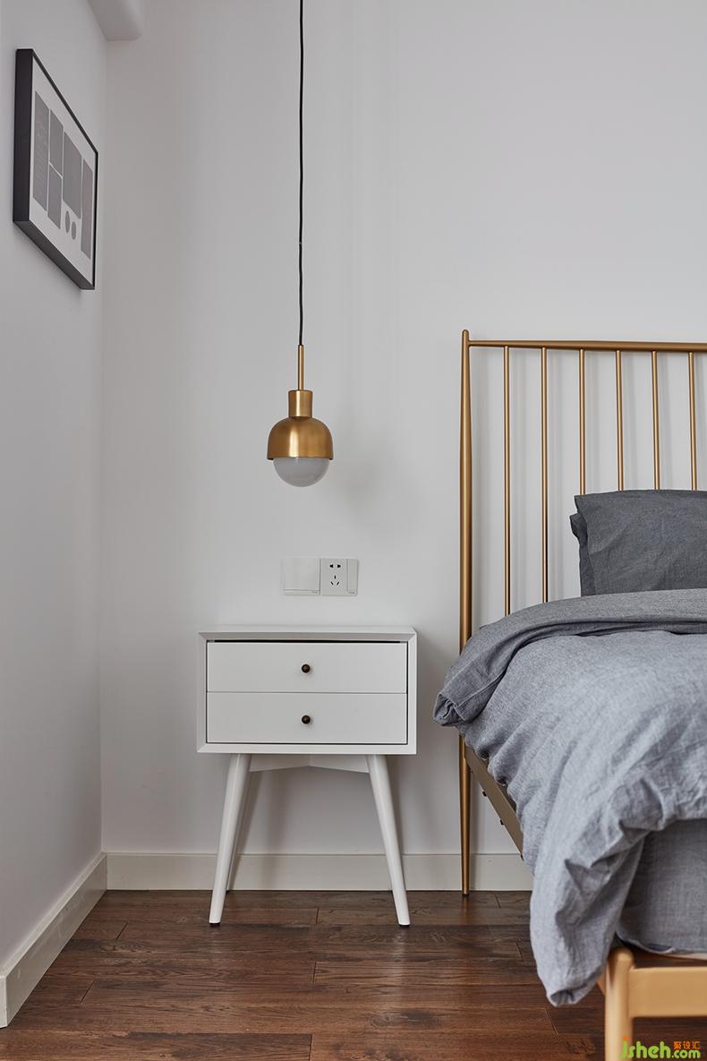 床纖細的金屬桿,顯得精致優(yōu)雅,床頭的兩盞吊燈,也是金屬感的,與床相呼應(yīng)。