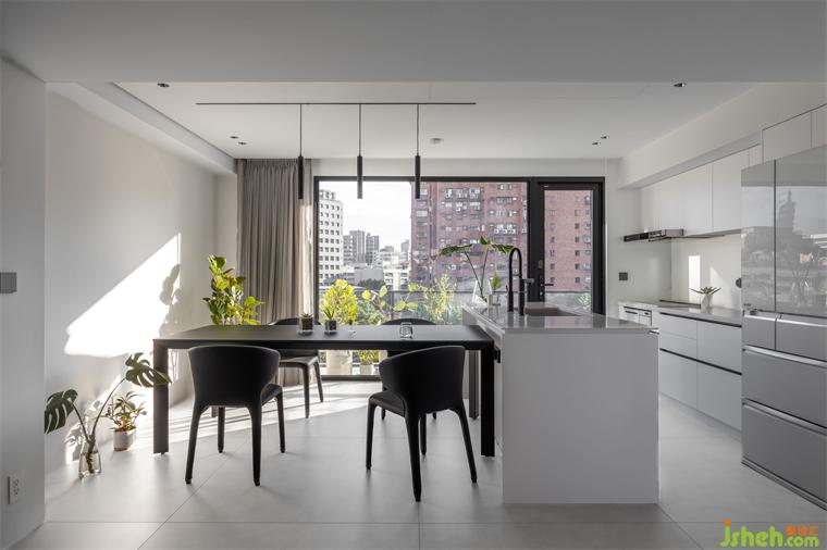 The kitchen adopts a white-themed design, harmonizing with kitchen appliances in the same color scheme. The countertop is crafted from smooth and easily maintained stone and the wall is covered with AICA antibacterial and fire-retardant wall panels. Magnetic sockets are strategically placed on the side of the island for convenient repositioning based on different needs. The dining table is elegantly illuminated by a lighting fixture in the same color tone. Once the foundational consistency and required functionalities are established, our primary concern shifts to the user's experience, ensuring long-term comfort and flexibility in usage.