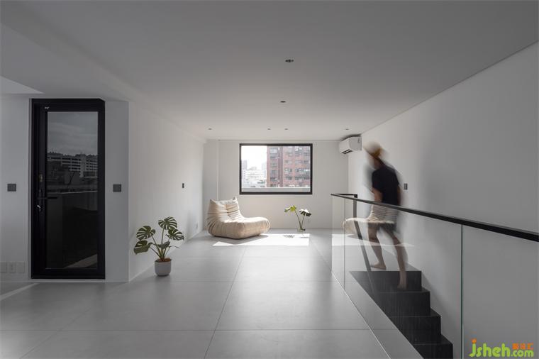 復(fù)式裝修設(shè)計(jì)得利于八樓充足的日光條件,在觀察陽(yáng)光照射?度及空氣對(duì)流狀態(tài)后,于北面露臺(tái)窗洞,劃設(shè)折疊氣密門,連接室內(nèi)外空間,亦有效放大視野。南面長(zhǎng)廊則規(guī)劃為辦公及瑜伽空間,當(dāng)需要深夜工作或進(jìn)行瑜伽冥想時(shí),得以僻一隅靜謐,與七樓的生活機(jī)能區(qū)隔開來(lái)。