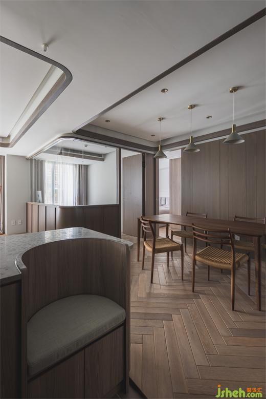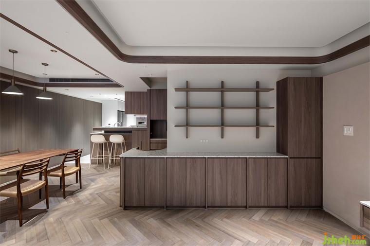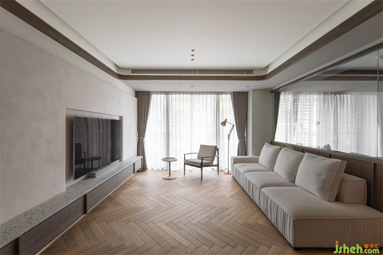 客廳天花板利用溝縫制造不同層次高度,同時定義場域性質(zhì),相偕人字拼地坪的漸進次序,大平層設計使視覺延展更添闊朗,此一概念延續(xù)至書房、餐廳,建立整體空間的一致性。