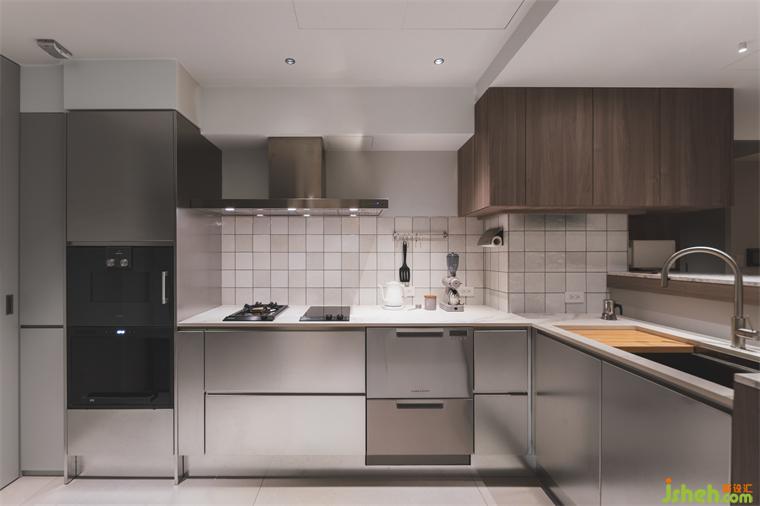 餐廳與廚房過道處,以相異材質(zhì)地坪,喻示空間轉換,并劃設一轉角吧臺,讓視線得以穿透,分而不隔建立對話平臺,方便女主人在料理時亦能關照家人。我們將廚具配置設定為L型動線,方便完成備料、烹煮等所有動作,也能一眼望見所需,依據(jù)置放邏輯,井然有序的完成料理。