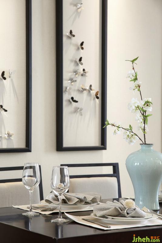 以蝴蝶實(shí)物畫為背景,頂部以黑鋼勾邊,優(yōu)雅又不失靈動(dòng),為餐廳營(yíng)造了時(shí)尚精致的用餐氛圍。