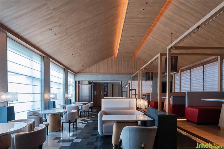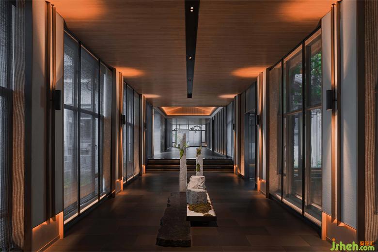 懸山頂?shù)奈蓓敱缓喕?,只保留了正脊和垂脊的線條碰撞在一起,呈現(xiàn)出幾何本質(zhì)的美。會館設(shè)計夜間以光作導(dǎo)引,簡約亦不失風(fēng)骨。不同的垂脊給室內(nèi)增添了不一樣的韻味,或曠達抒意,或典雅溫潤。設(shè)計師用大面積色塊在空間進行分割,使得其簡約但不簡陋,大氣規(guī)整。
