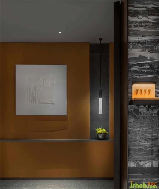 在物件比較冗雜的餐廳和大堂,設(shè)計師抽“框架”為形,行隔斷之用,所提煉之簡單外框,通直的線條元素運用在不同材質(zhì)和物件上,多而不雜,理繁為簡,將最可能凌亂的空間梳理地井井有條。