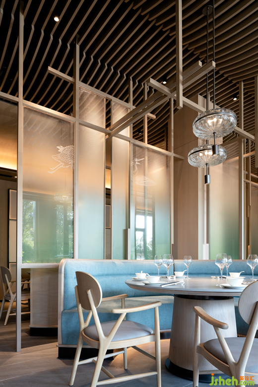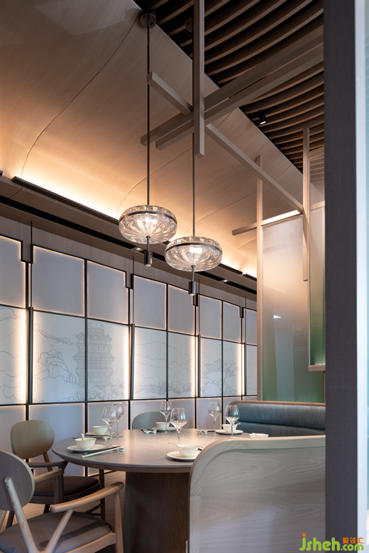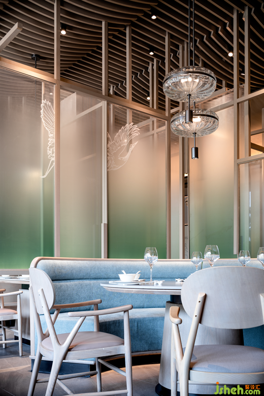 進(jìn)入零點區(qū),餐廳設(shè)計師不僅在設(shè)計中將東方空間氣質(zhì)與當(dāng)代視覺感受進(jìn)行融合,同時也融入了“江南飛檐”、“宋畫”、“園林構(gòu)成”等淮揚人文素材,并將提取的傳統(tǒng)淮揚元素進(jìn)行扁平化處理,同時使用折疊、疊加、拼貼等設(shè)計手法將抽象化元素進(jìn)行重構(gòu),形成一幅全新的、當(dāng)代的“淮揚長卷”。打造了零點區(qū)青蔥春日,白鶴飛舞上揚州的景象。