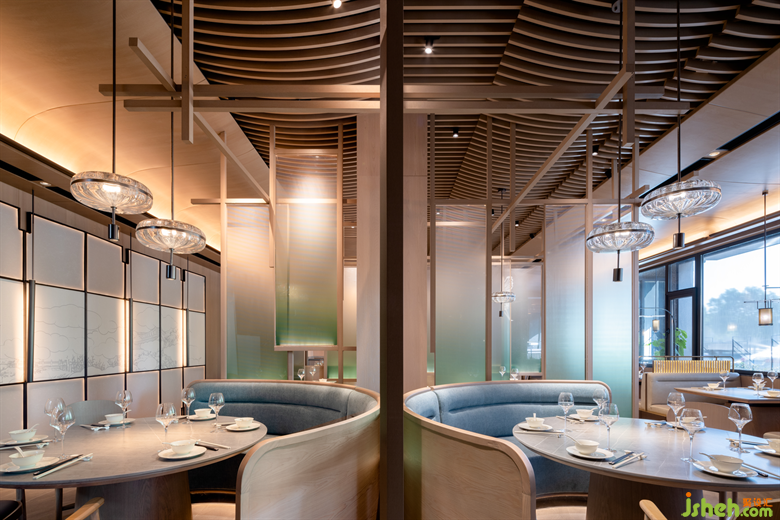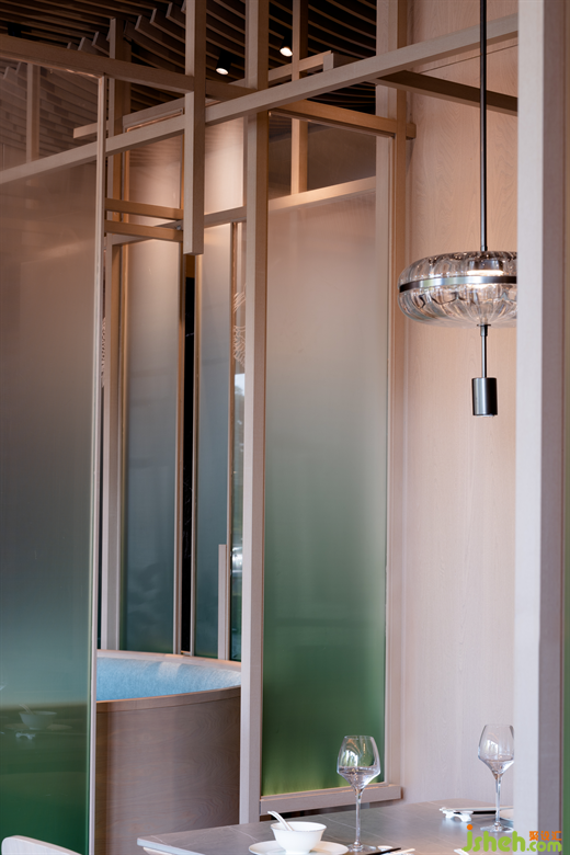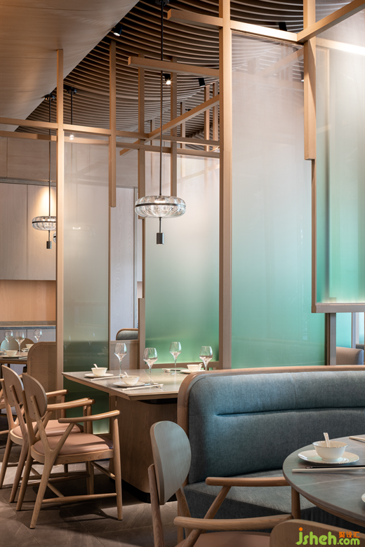 在來鶴臺廣場的滋奇臻品,餐廳設(shè)計師以木作框,以青色亞克力為隔斷,營造出透紗格柵的質(zhì)感,令光的滲入更具層次性的美感??臻g的內(nèi)飾凝聚著濃郁的傳統(tǒng)人文精神元素,呈現(xiàn)詩雅韻律。