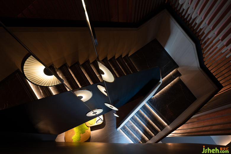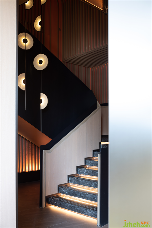 樓梯運用黑色與木色的轉(zhuǎn)折形成幾何感十足的連接空間,宛若向上延伸的長卷,空間中心的折扇定制燈極具揚州風味,成為這個空間的特別存在。