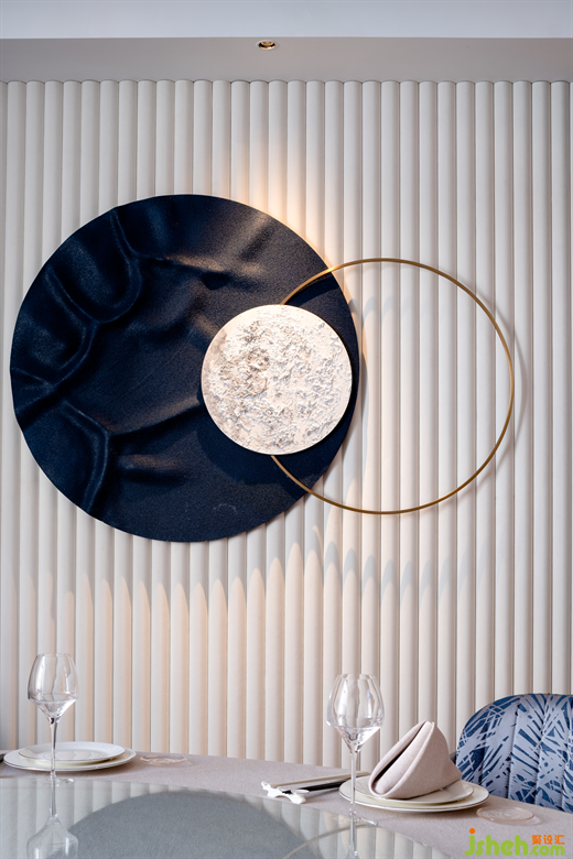 “青山隱隱水迢迢,秋盡江南草未凋。二十四橋明月夜,玉人何處教吹簫?”「銀月」的名字來源于杜牧的「寄揚(yáng)州韓綽判官」。取自瓷器的靛藍(lán)色點(diǎn)綴空間,背景墻的裝飾將滿月與弦月融合表達(dá),抽象的美將空間的戲劇化淋漓盡致的表達(dá),人文的情感與表達(dá)語言相互融合,將人置身于“情景”之中,感受溫潤雅致的新派意境。