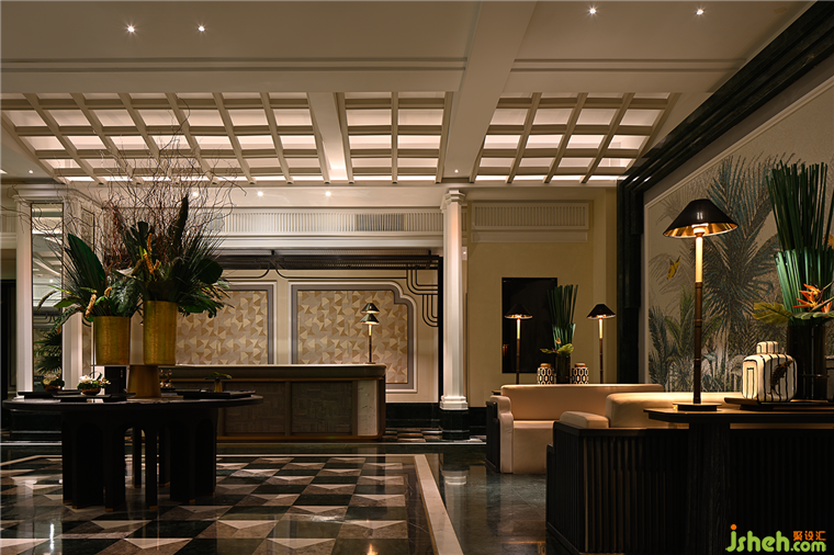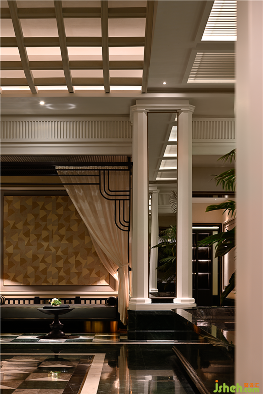 天花板上白色透光方格與背景墻的巨幅花鳥畫作相得益彰,構(gòu)成了復(fù)古的精致。散發(fā)出古典韻味。精致的鑲嵌拼花和銅制飾品,搭配深色馬賽克地板和白色羅馬柱,進(jìn)一步提升了空間的高雅氛圍。