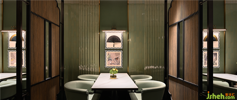 材質(zhì)及色彩運(yùn)用上,主打綠色,綠色有著健康、熱帶以及輕松的感覺。采用綠色釉面磚,肌理漆,皮質(zhì)座椅以及綠色植物的裝飾來配合整體空間。