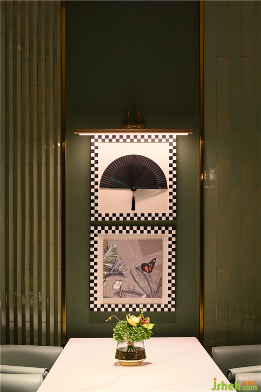 綠色的墻面像是一層厚厚的雨林土壤,濃郁的風(fēng)格,給空間帶來自然的感覺,降低了現(xiàn)代氣息。當(dāng)線條輕盈的家具與綠色相遇,文藝而時(shí)尚,黃銅的裝飾屏風(fēng)自帶輕奢氣質(zhì),在空間中散發(fā)著優(yōu)雅從容的高級感。