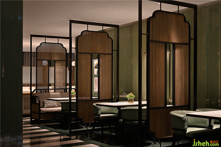 在各種不同紋理的各種裝飾圖案的突出下,半環(huán)繞式的卡座處融入了由格柵圍合的空間。夜幕降臨,無數(shù)的燈光照亮了昏暗的空間,夢幻般的異國風(fēng)情在每一個(gè)角落展現(xiàn)出來。