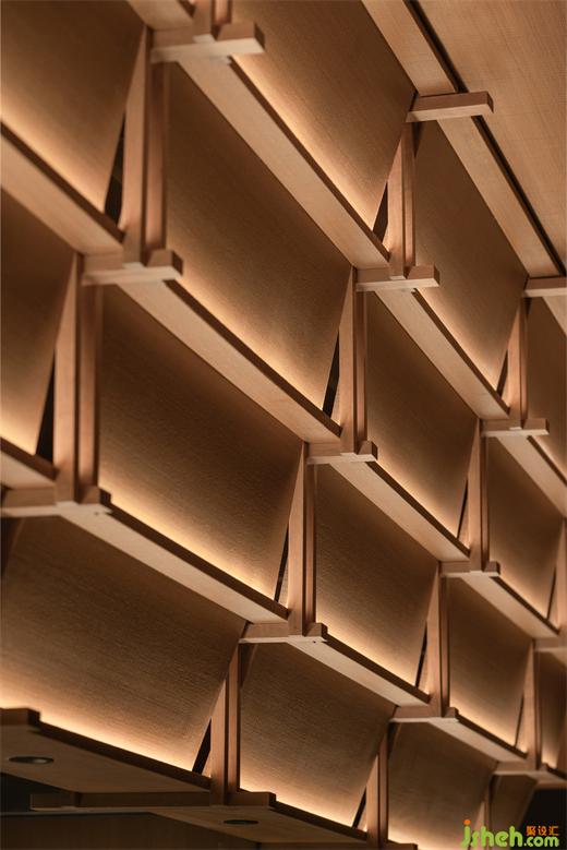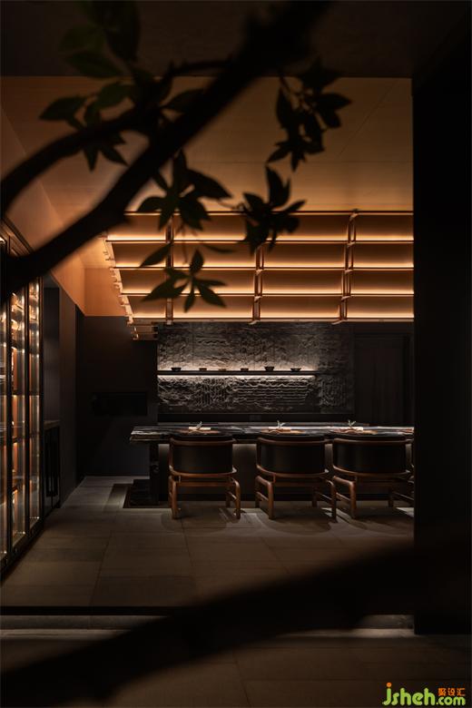 松聲靜夜聞,月光涵露重??臻g欲揚(yáng)先抑,素黑幽玄的環(huán)境中包含著對(duì)自然的敬意和縮影,雪松、巖石、明月,如在筆墨間。日料餐廳設(shè)計(jì)建筑并未寓意過多,沉寂幽玄的光影帶來的克制讓觀者將悲喜收于內(nèi),卻也牽出夢的絲線,掛于松雪之末,月隱婆娑處。
