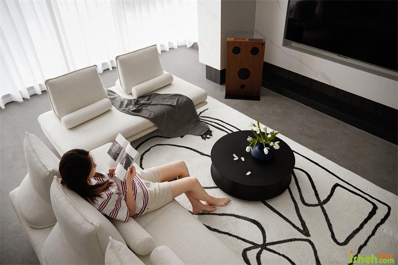 客廳由黑白灰三色主導(dǎo),協(xié)調(diào)的色彩比例讓整體空間富有層次感。深色墻板搭配白色巖板構(gòu)成電視背景墻,為室內(nèi)注入幾分沉穩(wěn)靜謐之意。