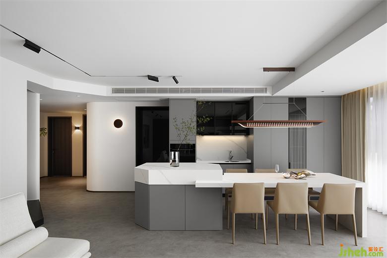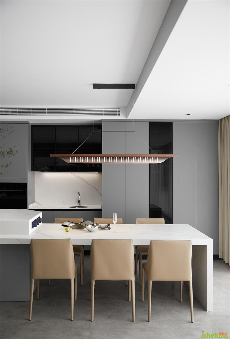餐廳延續(xù)客廳的灰白主色調(diào),暖色餐椅搭配富有設(shè)計感的金屬吊燈,家裝設(shè)計為空間增添了溫馨氛圍。島臺與餐廳的一體化設(shè)計,既滿足正餐的使用,也兼顧了下午茶以及工作社交的需求。