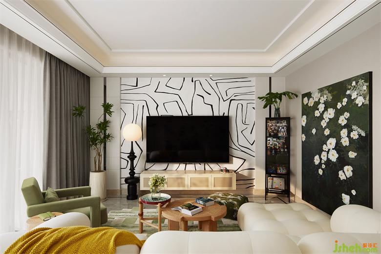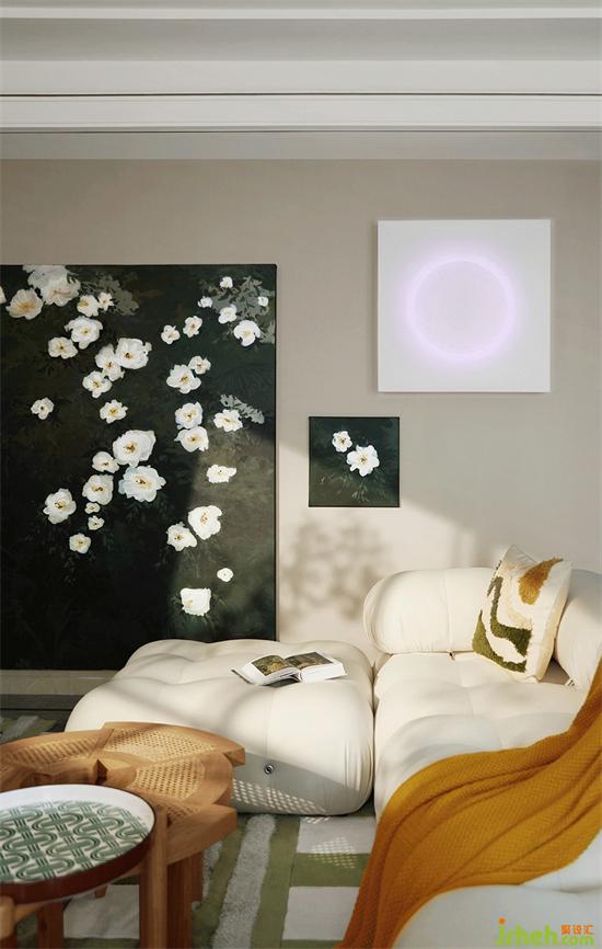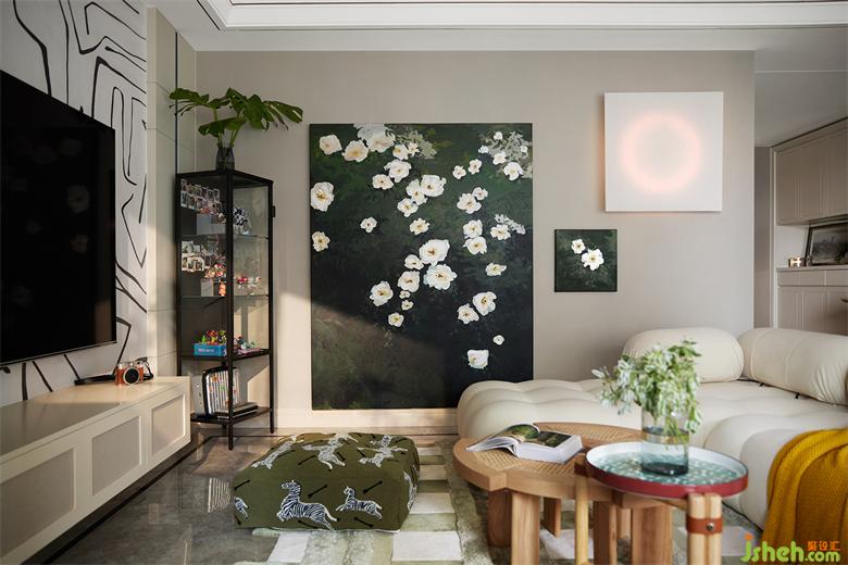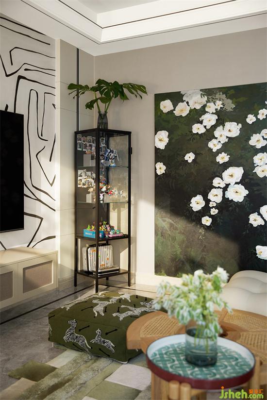 客廳中放置著業(yè)主親手畫的洋桔梗,墨綠色的畫布背景將潔白的花朵襯托得愈加柔美溫麗,家裝設(shè)計(jì)頗有“筆花數(shù)點(diǎn)開天地,玉影一枝凈無塵”的美感。