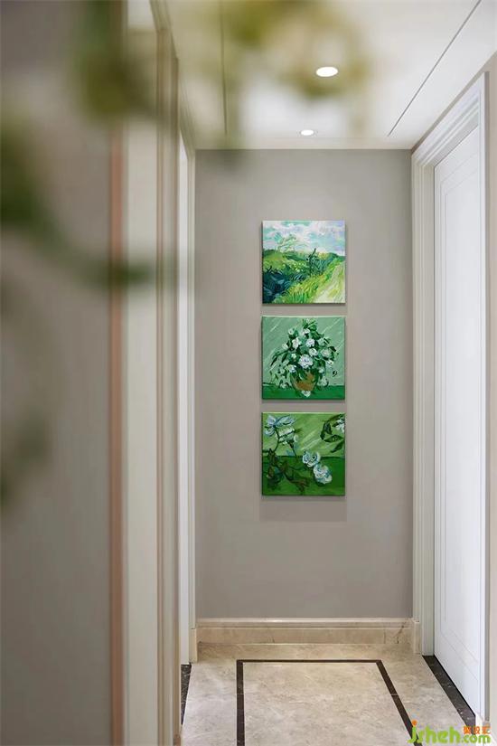 玄關(guān)處的三小幅綠色丙烯版畫,取材自然,家裝設(shè)計(jì)讓走進(jìn)的人仿佛嗅到了清新芬芳的花草味道。