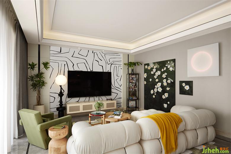 家裝設(shè)計(jì)師將原有的電視背景墻墻紙換為了藝術(shù)幾何相間的造型,硬朗折線的堆疊碰撞,中和了空間的柔麗。