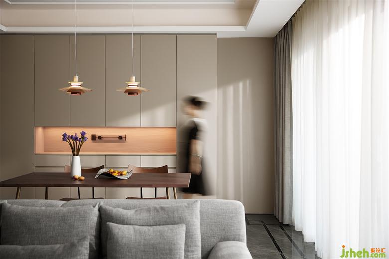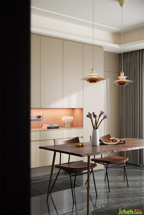 設(shè)計(jì)師采用簡(jiǎn)單輕盈的家具,讓餐廳成為小兩口共享三餐、互動(dòng)交流的溫馨之地。原木材質(zhì)的餐桌與餐椅為空間帶來(lái)溫潤(rùn)簡(jiǎn)雅的氣質(zhì),家裝設(shè)計(jì)營(yíng)造出恬靜的用餐環(huán)境。同時(shí)餐桌旁邊增設(shè)備餐臺(tái),充足的柜體滿足業(yè)主的收納需求,加大空間的利用率。